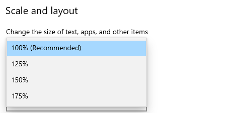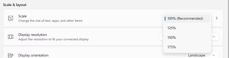 - Set the Scaled to 100% - NOTE: Not all displays will show 100% as "Recommended", but you must choose that scale.